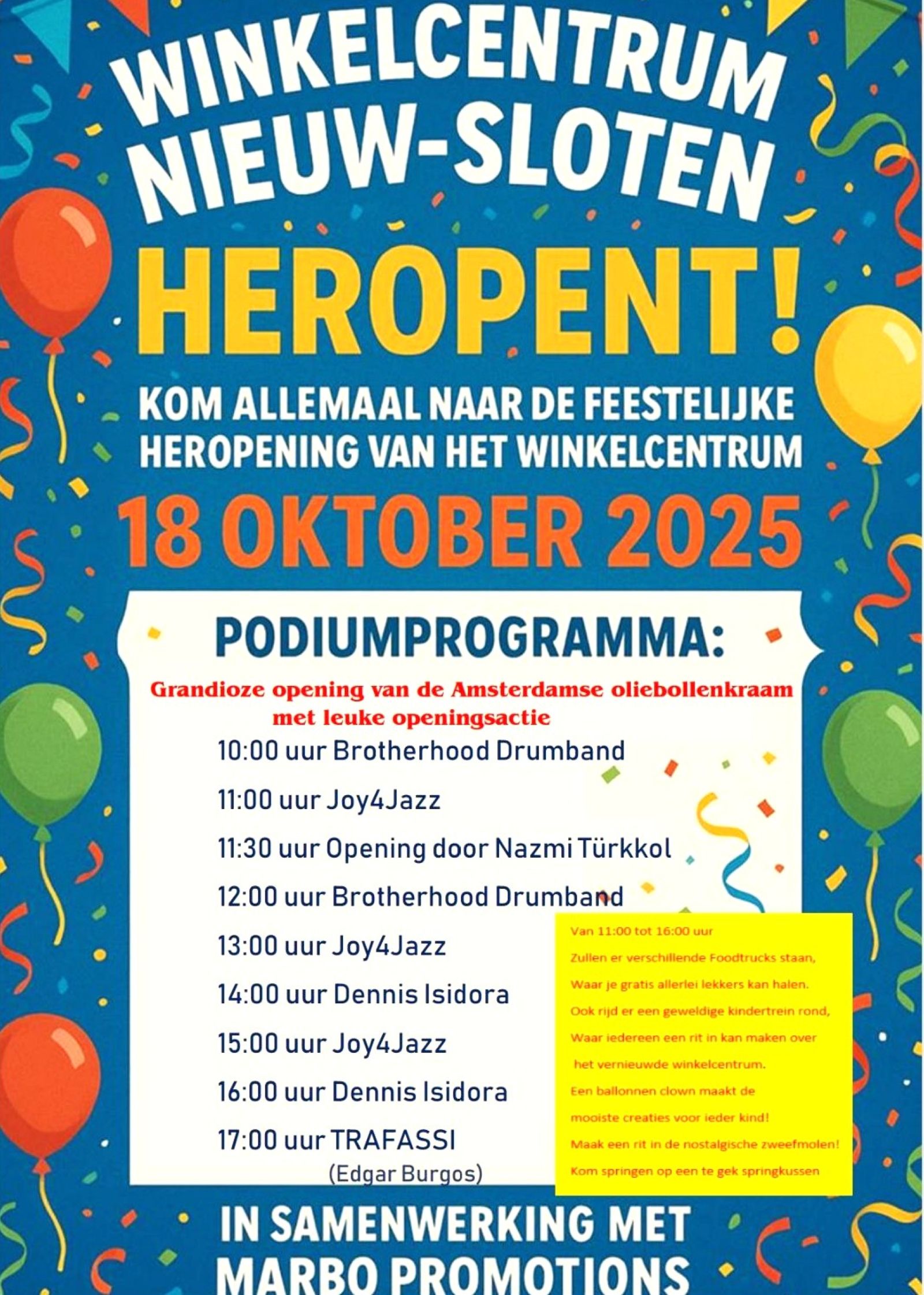 • 10.00 – 17.30 uur: Feestelijke heropening van Winkelcentrum Nieuw Sloten op het Belgiëplein. Het heeft érg lang geduurd, maar de klus is zowaar bijna geklaard. Optredens van Brotherhood Drumband, Joy4Jazz, Dennis Isidora en Trafassi (Edgar Burgos). Om 11.30 uur verricht stadsdeelbestuurder Nazmi Türkkol de officiële opening. Tussen 11 en 16 uur: foodtrucks met gratis lekkernijen. Gratis kinderactiviteiten: kindertrein, ballonnen clown, springkussen en zweefmolen. Programma met o.a. tijden optredens artiesten.