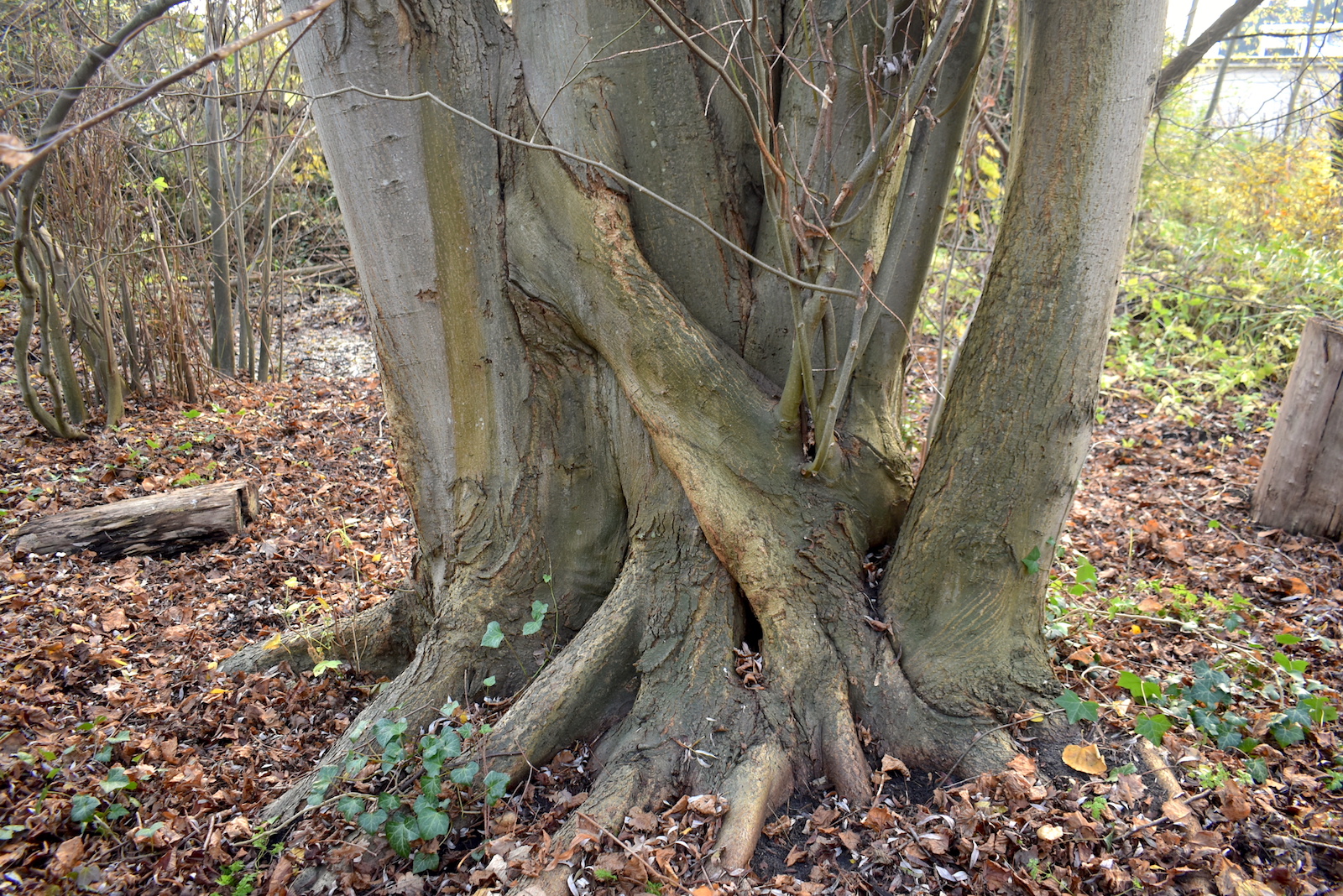 De zes stammen van de lindeboom bij de Magazijngebouwen. Vooral de diagonale structuur oogt heel speciaal; 4 december 2025. Foto: Erik Swierstra.