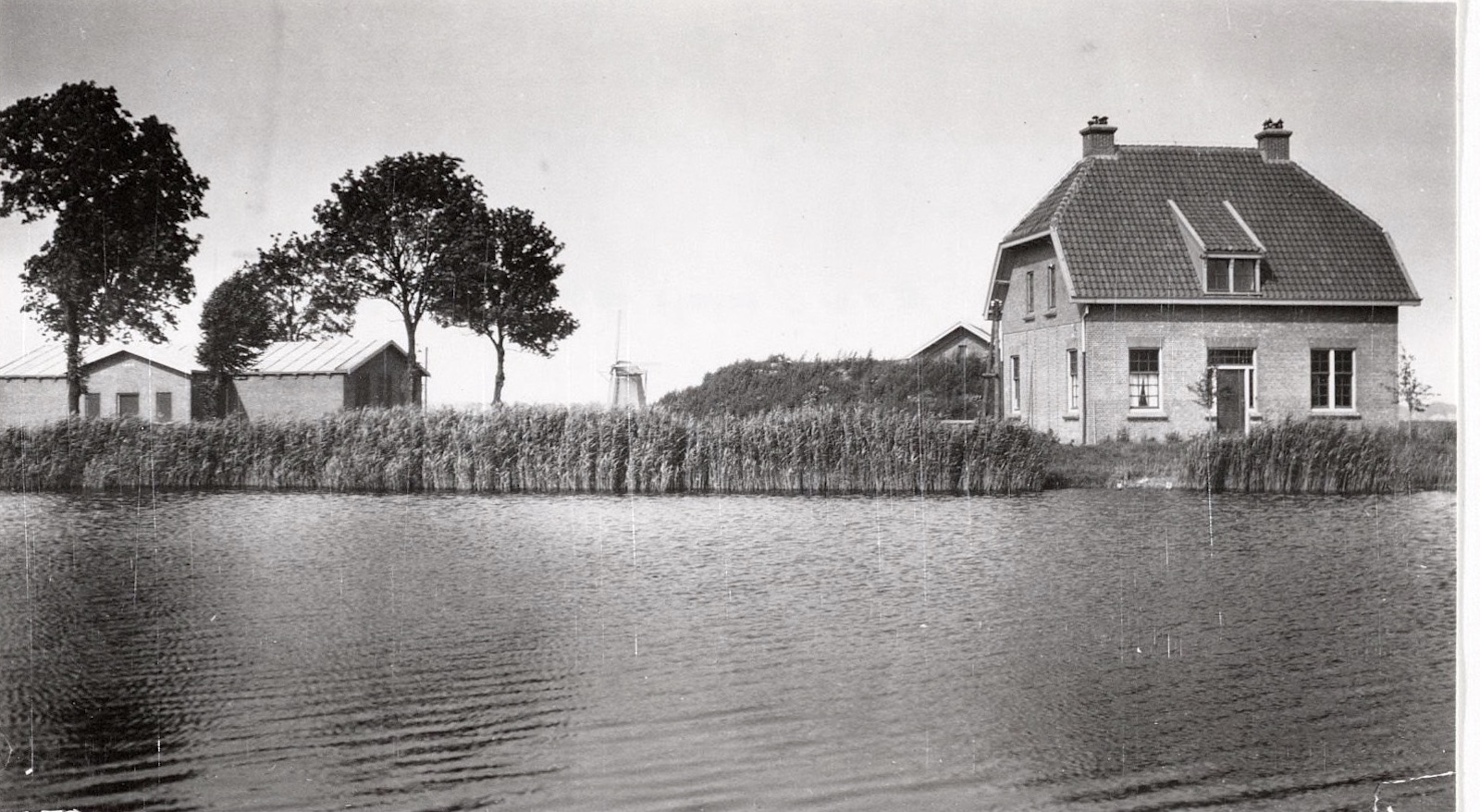 Zicht vanaf de Ringvaartdijk naar het oosten. Het fortwachtershuis met daarachter een munitiemagazijn met omwalling. Links een loods die nog steeds aanwezig is, in het midden in de verte de Riekermolen. Foto: J. van Eck; 1922.