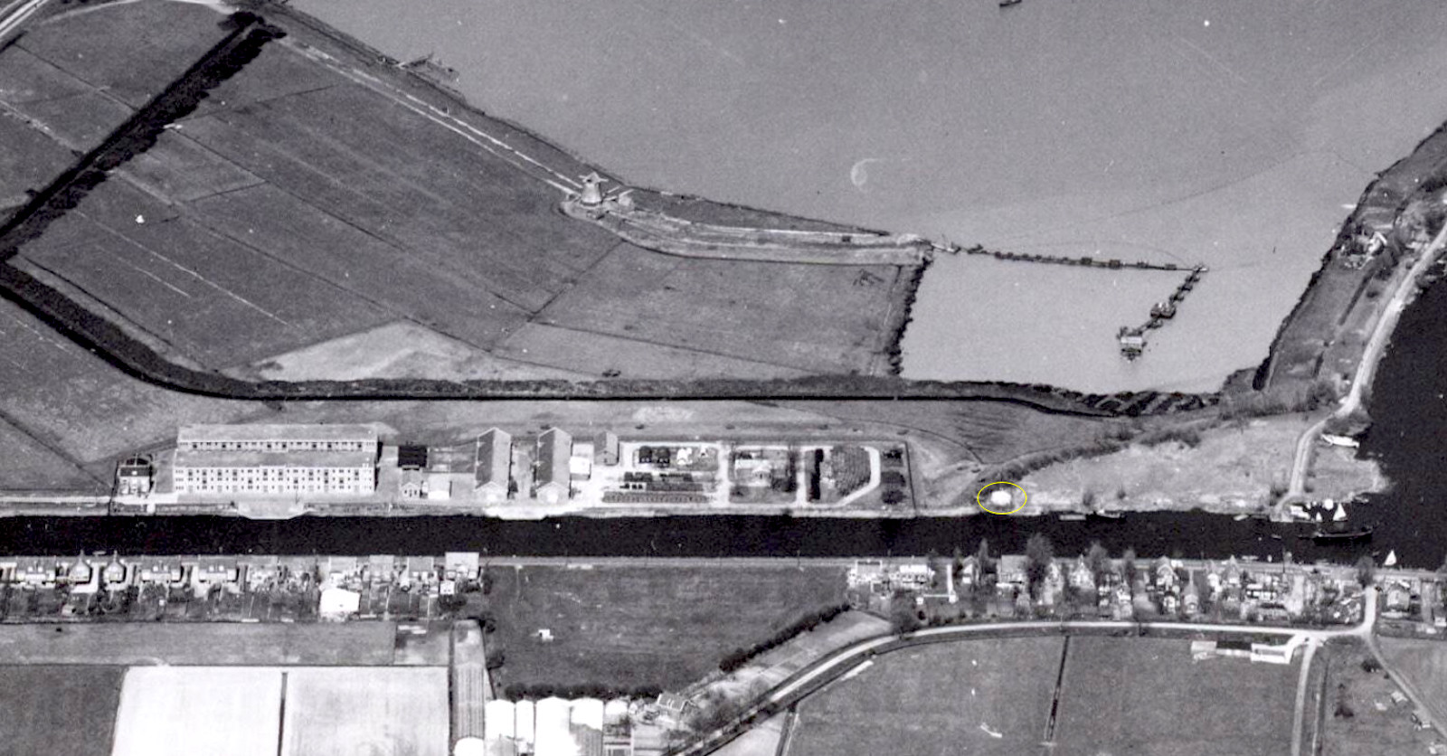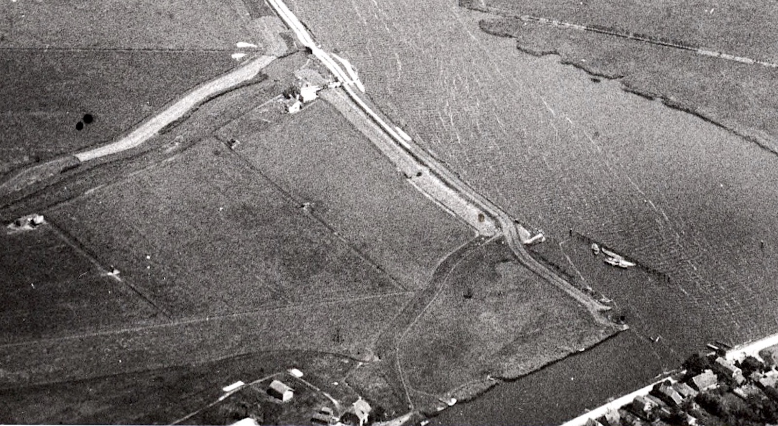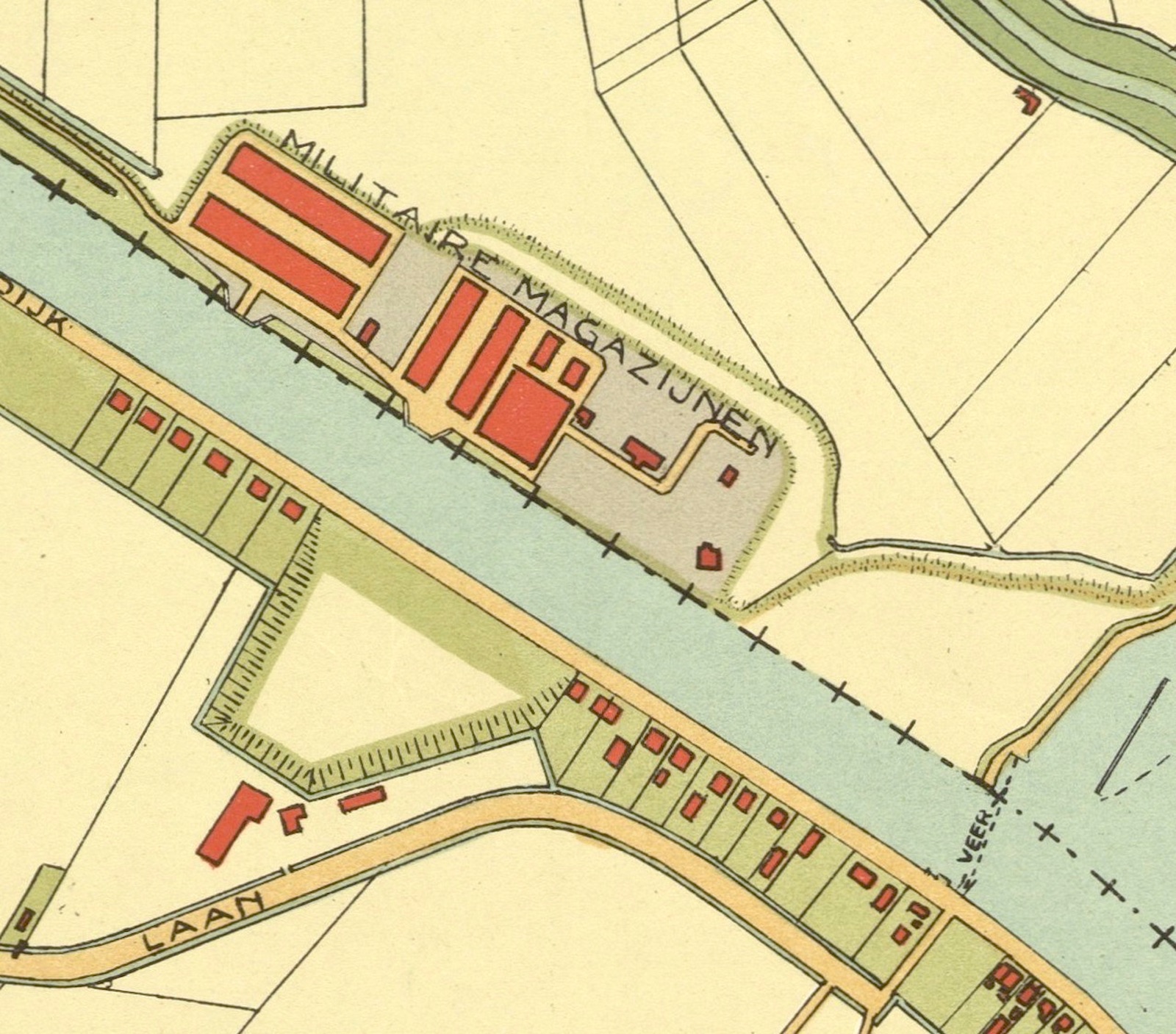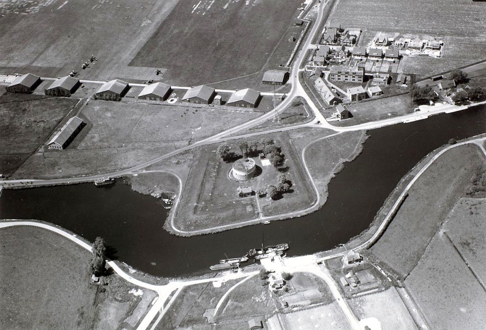 Vlak aan de Ringvaart, midden onder, staat het huis van de fortwachter. Links daarvan een magazijn van explosieven binnen een aarden omwalling. De aanplemping rechts is goed zichtbaar. Midden boven Café Opoe. Rechtsonder de veerpont van Piet Eilander over de Ringvaart tussen het Jaagpad en de Ringvaartdijk: 1931 (detail van een luchtfoto).
