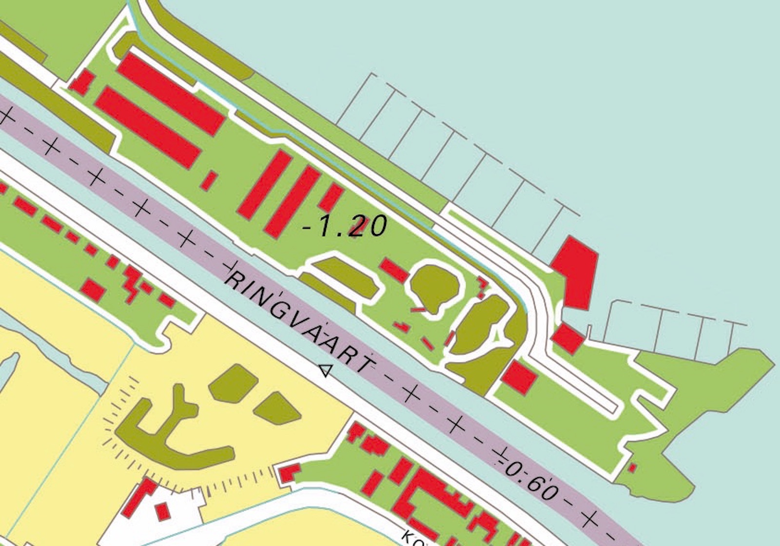 Uitsnede van een Kadasterkaart van de omgeving van ‘Nieuw en Meer’; 2025. In het groene gebied in het midden de vroegere Militaire Magazijnen. Boven is de Nieuwe Meer. Rechts aan het einde het terrein van de jachthaven. Onder de Ringvaart zijn de contouren zichtbaar van het vroegere Fort aan de Nieuwe Meer.