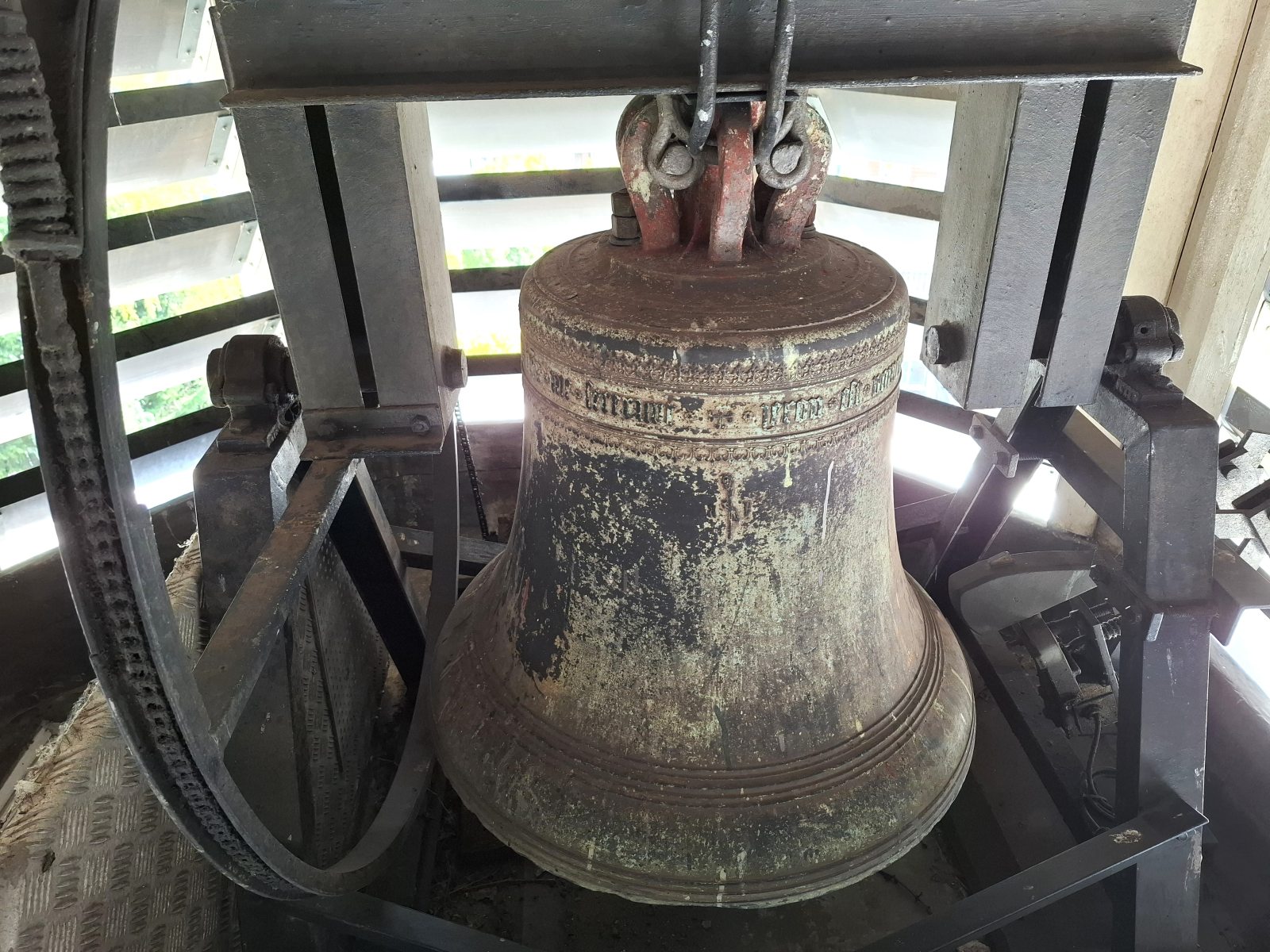 Hoog in de kerktoren meldt de eeuwenoude klok onvermoeibaar ieder half uur hoe laat het is. In de rand van de klok staan alle gegevens gegraveerd.