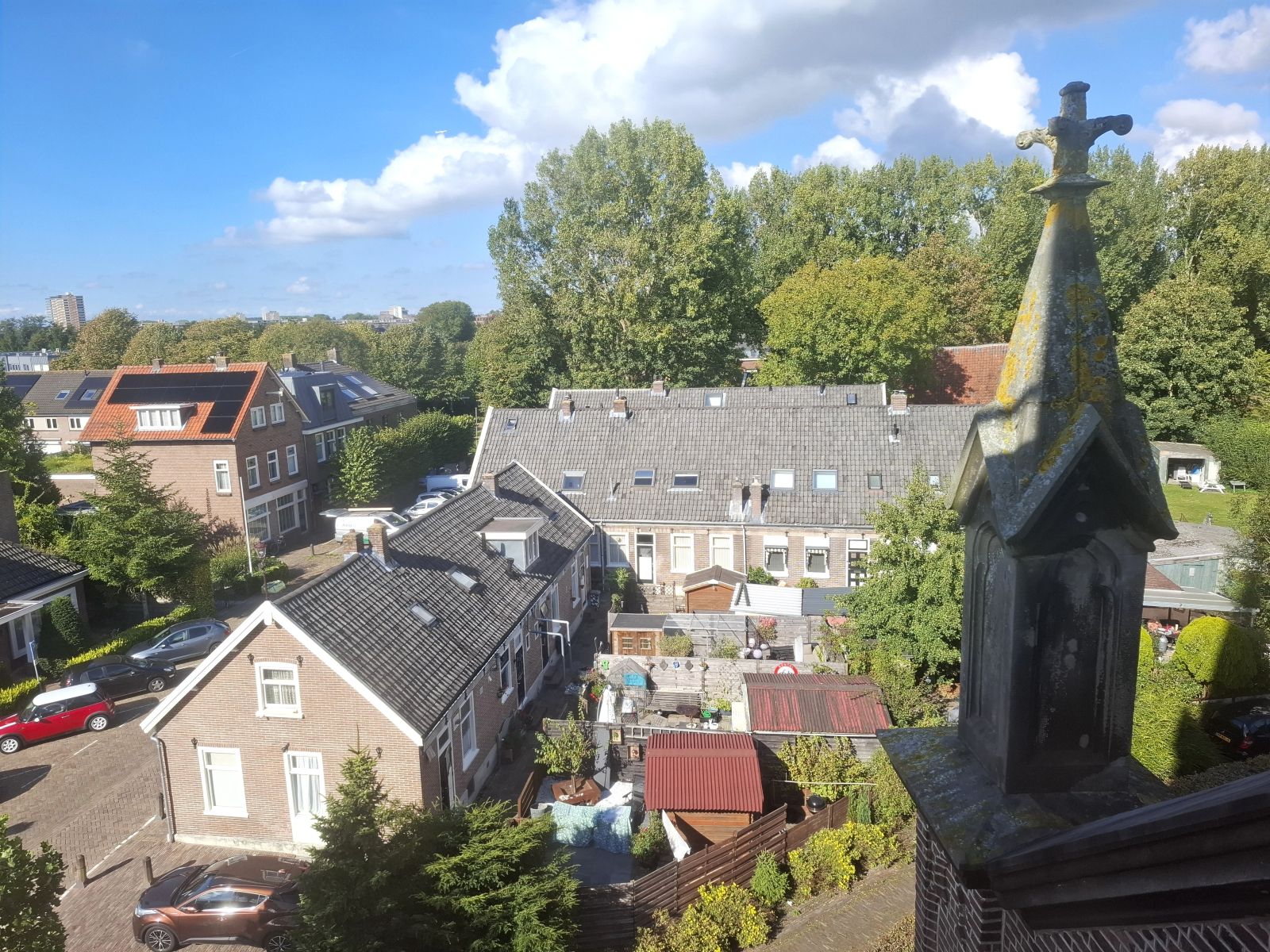 En tot slot: zicht in noordelijke richting met de andere pinakel. Daarachter het monumentale complex arbeiderswoningen met de tuintjes, die niet direct aan de woningen grenzen. Medewerkers van de afdeling Monumenten en Archeologie van de gemeente hebben herhaaldelijk benadrukt hoe bijzonder dit hofje is. Mogelijk bestaat er in heel Nederland geen – of slechts een enkel ander – vergelijkbaar hofje.