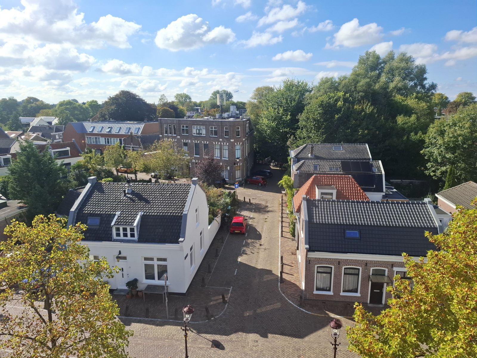 Zicht in westelijke richting: de Nieuwe Akerweg en de Akerpolderstraat met prominente in het midden het Wees- en Armenhuis.