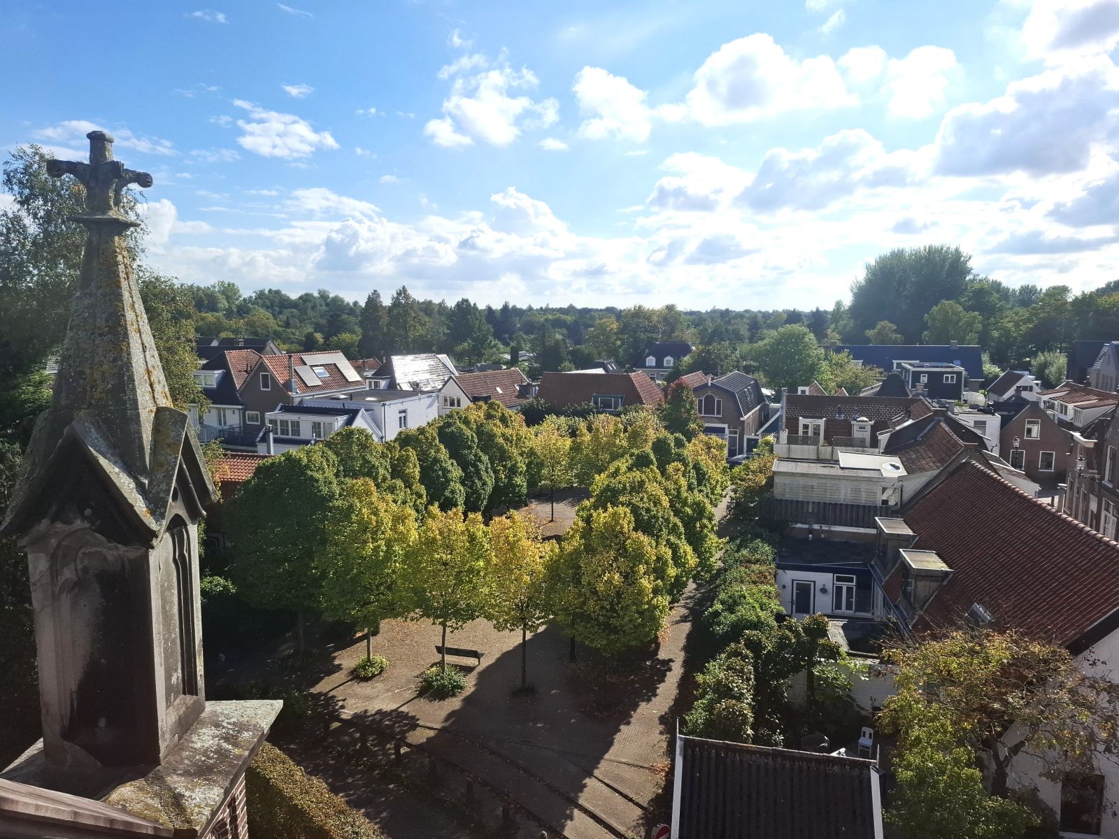 Het dorp Sloten vanuit de toren van de Sloterkerk gezien in zuidelijke richting met op de voorgrond het Dorpsplein. Links op de voorgrond een van beide pinakels, die kenmerkend zijn voor het aangezicht van dit monumentale kerkgebouw. Een pinakel dient niet alleen ter versiering van het pand. Het ‘uitsteeksel’ is met name bouwtechnisch van belang. Beide pinakels zorgen voor verzwaring en dus voor extra druk op de steunberen. Hierdoor wordt het gewicht van het zware dak beter verdeeld en is de constructie sterker.