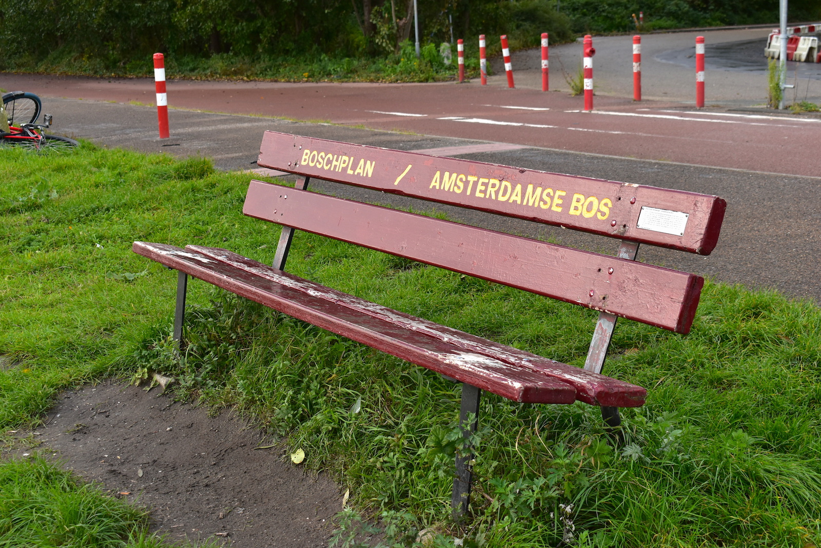Langs het Jaagpad nabij de Riekerweg, met uitzicht op het bos, staat sinds 2025 de bank ‘Boschplan / Amsterdamse Bos’.