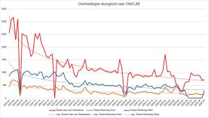 Deze grafiek geeft het aantal uitgedeelde boetes in de periode januari 2024 – september 2025 per week bij de verschillende knips aan. Het is duidelijk dat de trend dalend is. Maar er zijn nog altijd heel wat automobilisten die na twee weken een boete op de mat treffen. De gekleurde lijnen geven het aantal boetes aan: de rode op beide takken van de Laan van Vlaanderen in Nieuw Sloten, de blauwe op de Sloterweg-West en de oranje op de Sloterweg-Oost.