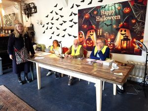 Uiteraard kwam ook Dinie – van de Ditlaar – haar stem uitbrengen. Alle drie de leden van het stembureau wonen in de buurt: een op Sloten en de beide anderen in Nieuw Sloten. Als altijd was het erg gezellig in het Slotense stembureau dat al in Halloweensfeer was gehuld. Foto: Tamar Frankfurther.