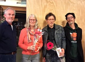 De initiatiefnemers van beide Slotense projecten zijn erg blij dat zij de aangevraagde bijdragen uit het Buurtbudget hebben binnengesleept. Van links naar rechts: Anne Nicolai en Hella Hendriks van de Dorpshuis-tuin en het Dorpshuis en Jasen Jakiç en Andres van Beek van ‘Outdoor Life’ bij de Rijks Hemelvaart Dienst bij De Oeverlanden. Foto: Ria Egberts.