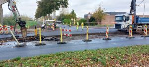 De gemeente had na het ongeval nog een dag nodig om de berm alsnog met tijdelijke bakens te barricaderen. Inmiddels is de middenberm op de kruising – ter voorbereiding op de permanente inrichting – uitgegraven. Het is niet bekend wanneer de gemeente de permanente afzetting zal plaatsen. Foto: Theo Durenkamp.