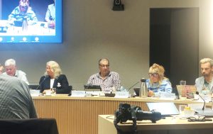 Reina van Zwoll van De Groenen / Basispiraten (tweede van rechts en op het beeldscherm) leest haar motie voor in de stadsdeelcommissie-vergadering van 9 september. Dit verzoek werd unaniem ondersteund: “Wij verzoeken het College van B&W en de leden van de commissie RO een uiterste inspanning te doen om te onderzoeken hoe zoveel mogelijk grond in de Lutkemeerpolder onbebouwd kan blijven ten behoeve van regeneratieve landbouw, een mogelijk voedselpark of andere maatschappelijk gewenste functies.” Ook de PvdA sprak zich duidelijk uit: het is tijd voor een andere keuze en een toekomstbestendige invulling van de polder. D66 gaf aan dat zij twintig jaar geleden al als enige tegen de bouw van distributiehallen in de Lutkemeerpolder stemde. Des te opvallender is de houding van de D66-wethouder nu. Hij kiest tot nu toe voor de korte termijnwinst om de Lutkemeerpolder vol te bouwen met distributiehallen. Foto: Iris Poels.