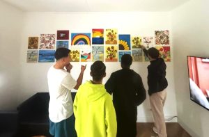 De jonge vluchtelingen fleuren hun opvanglocatie op met zelfgemaakte schilderijen. Nu de opvang aan de Sloterweg langer open zal blijven, zullen er vast nog veel meer muren gevuld worden met hun kunstwerken. Foto: AZC Sloterweg.